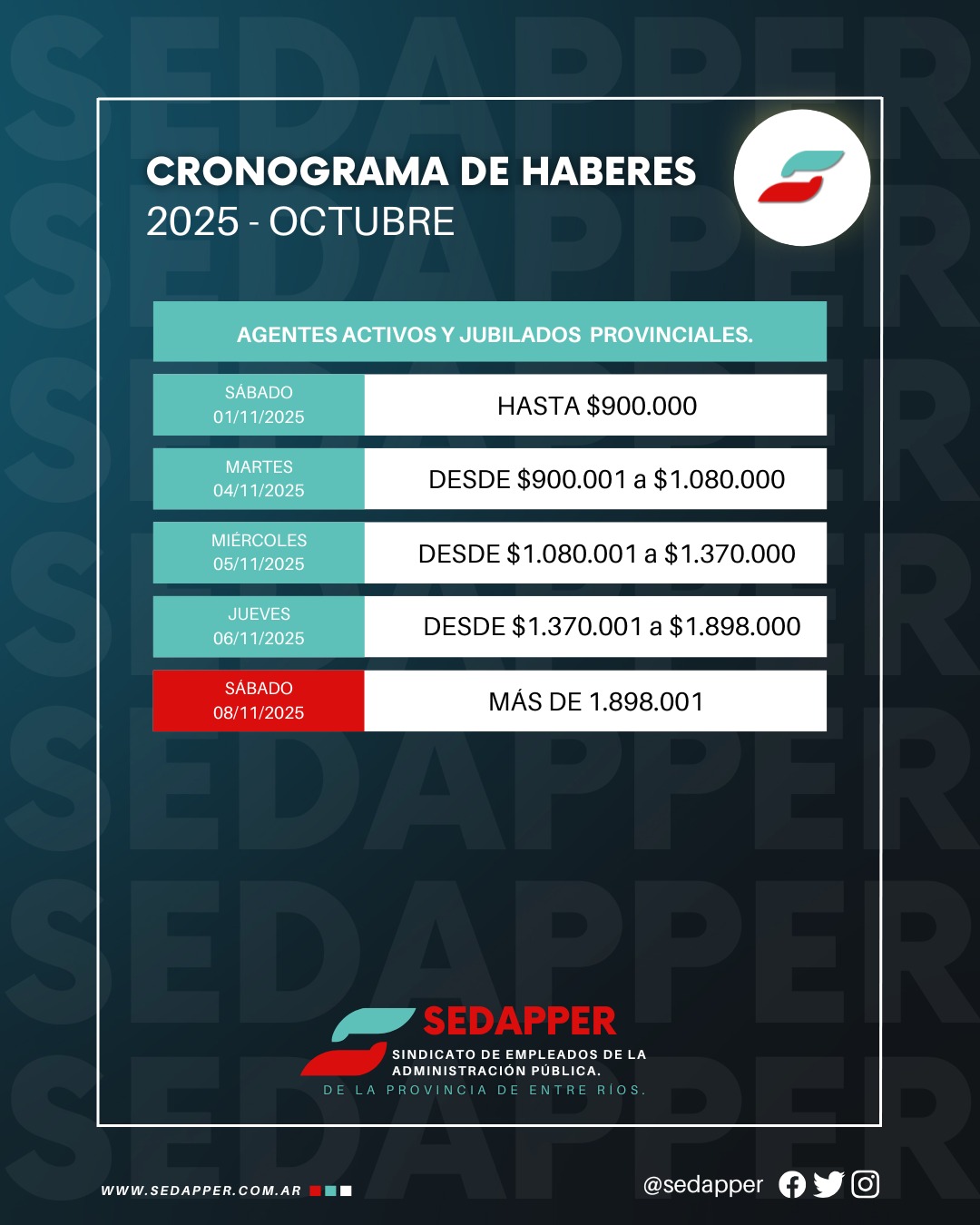 De acuerdo a lo informado por el gobierno provincial el Sedapper comunica que el cronograma de pagos para los haberes del mes de octubre, de activos y pasivos de la administración pública de Entre Ríos, inicia el lunes 3 de noviembre.